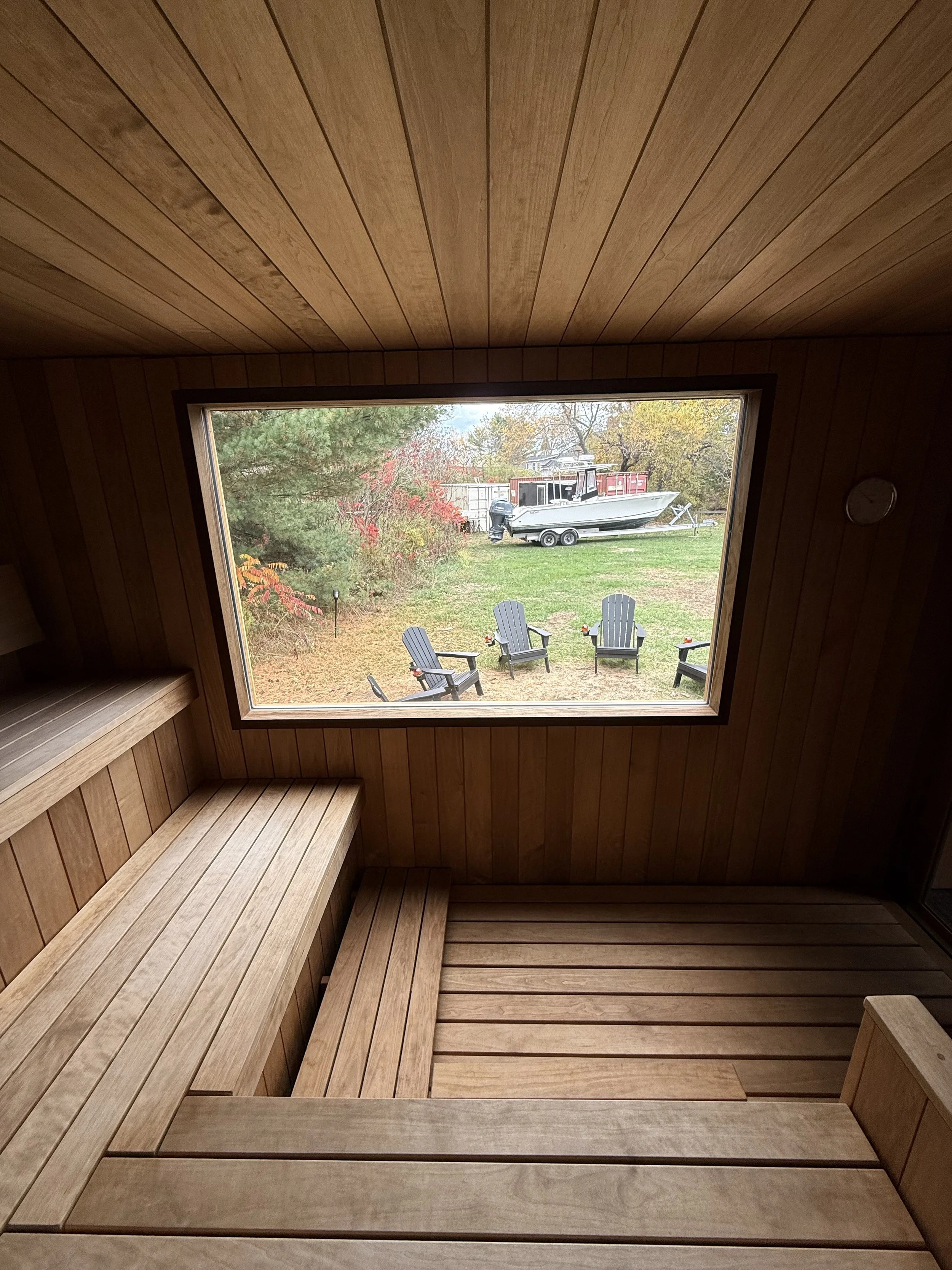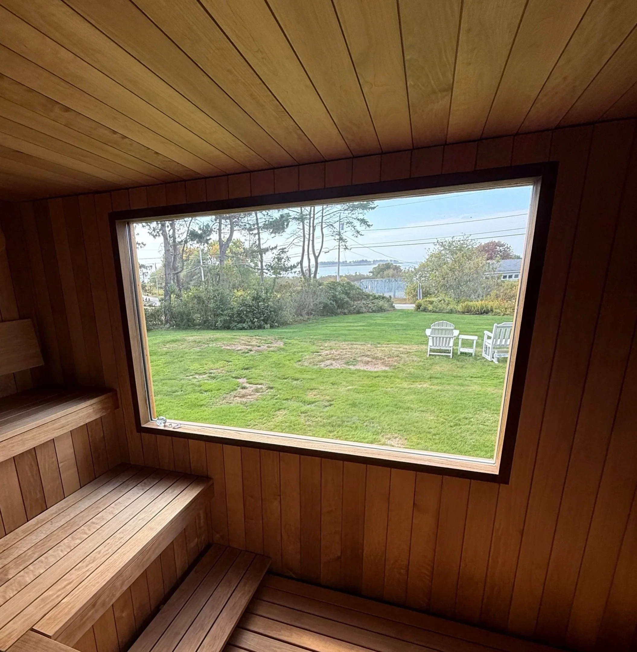 Our large picture window is double-glazed, ensuring that your view of the outdoors never detracts from the heat—and it won’t fog up. The sauna’s design invites you to soak in nature while staying wrapped in warmth, a rare gift during Maine’s long winters. Here, you don’t have to choose between comfort and connection—you can have both.