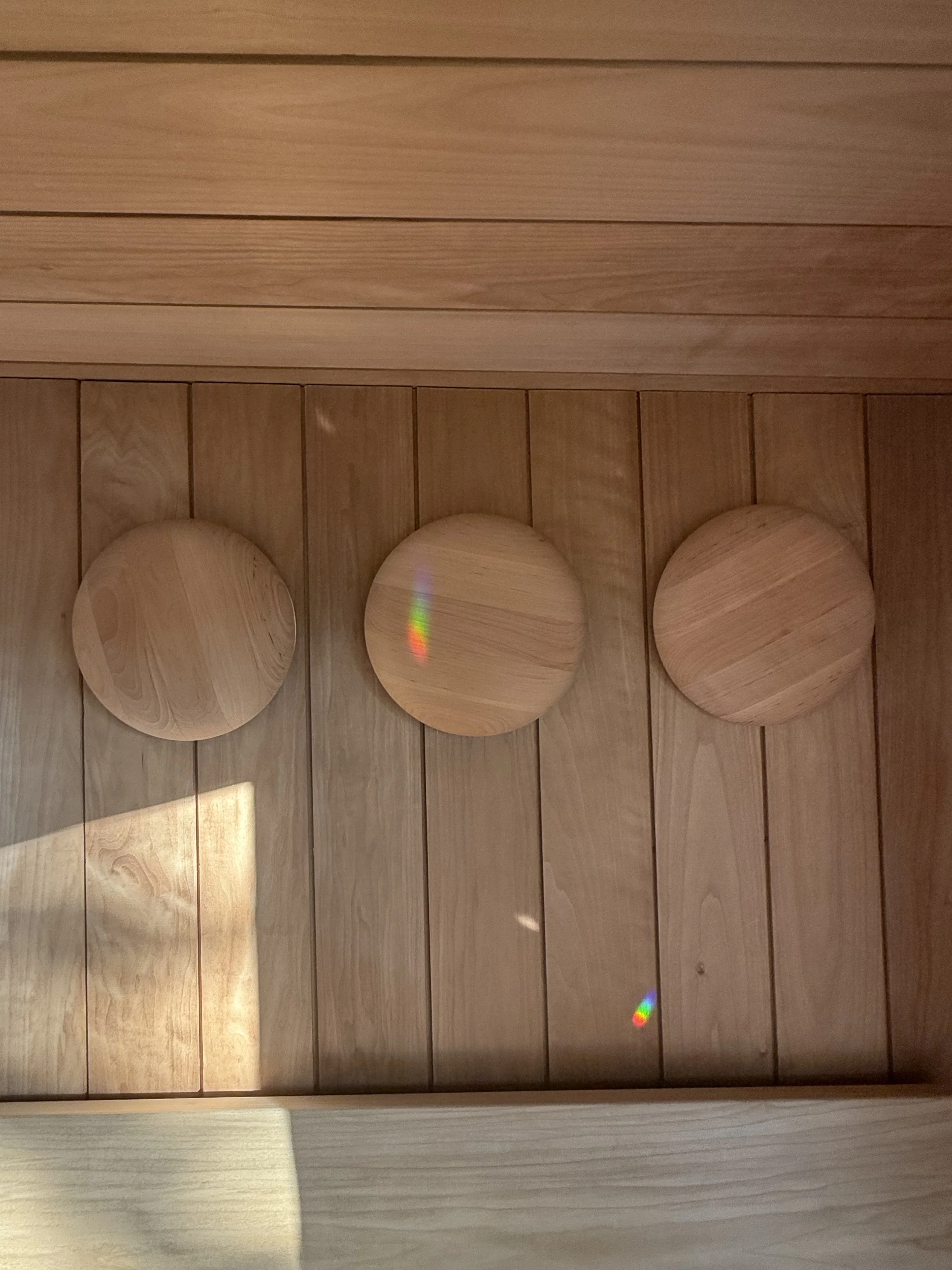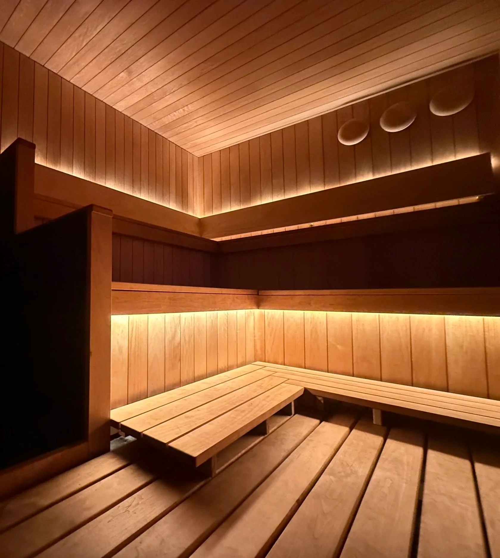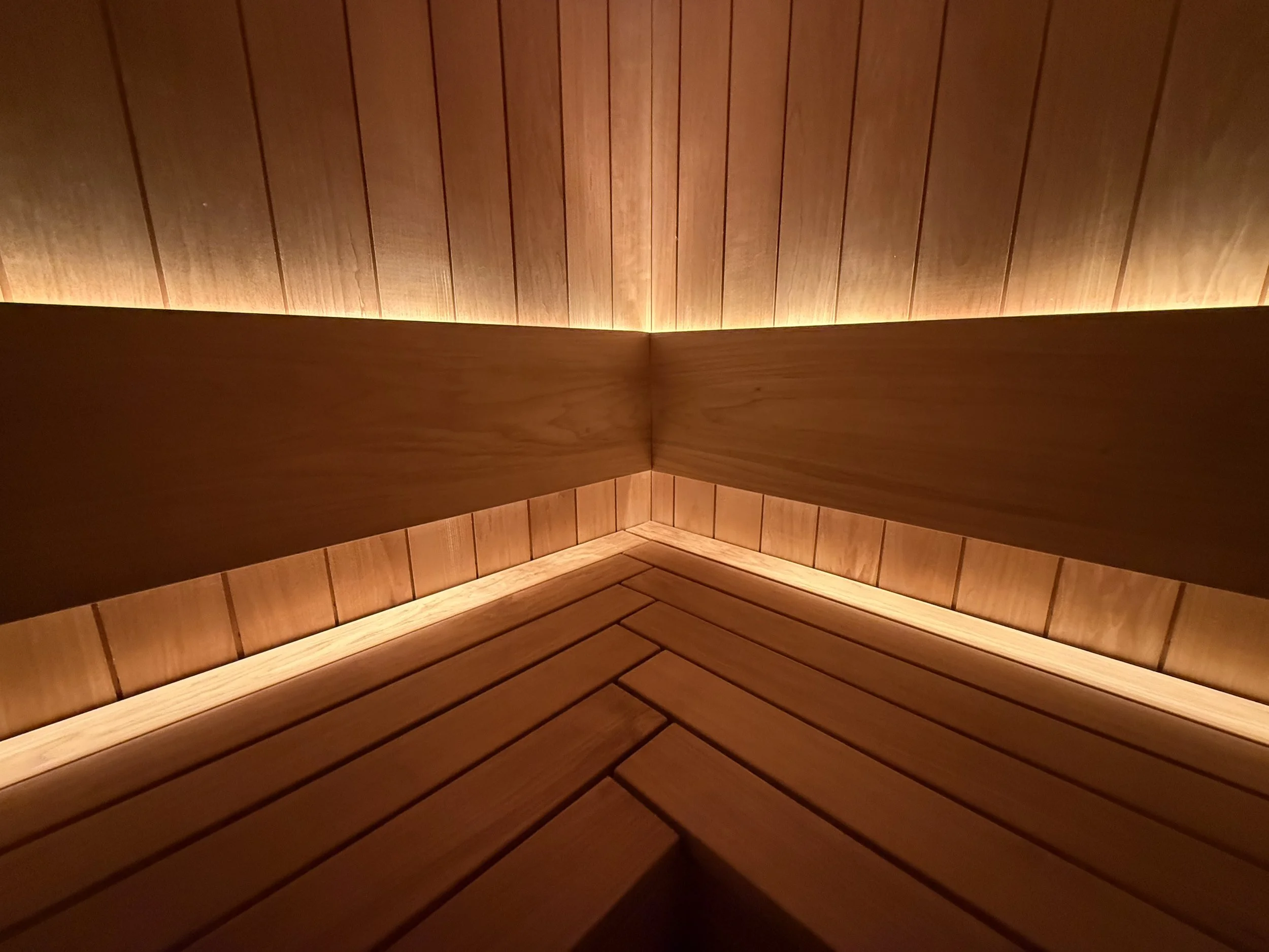 We wanted every detail of the sauna to be optimized for our guests’ comfort, so we went to great lengths to locally source and custom-build a hypoallergenic backrest with a continuous grain pattern, hung at the perfect angle for full-body support. No stiff, vertical backrests or aching spines here—just effortless comfort that lets you fully relax into the heat.