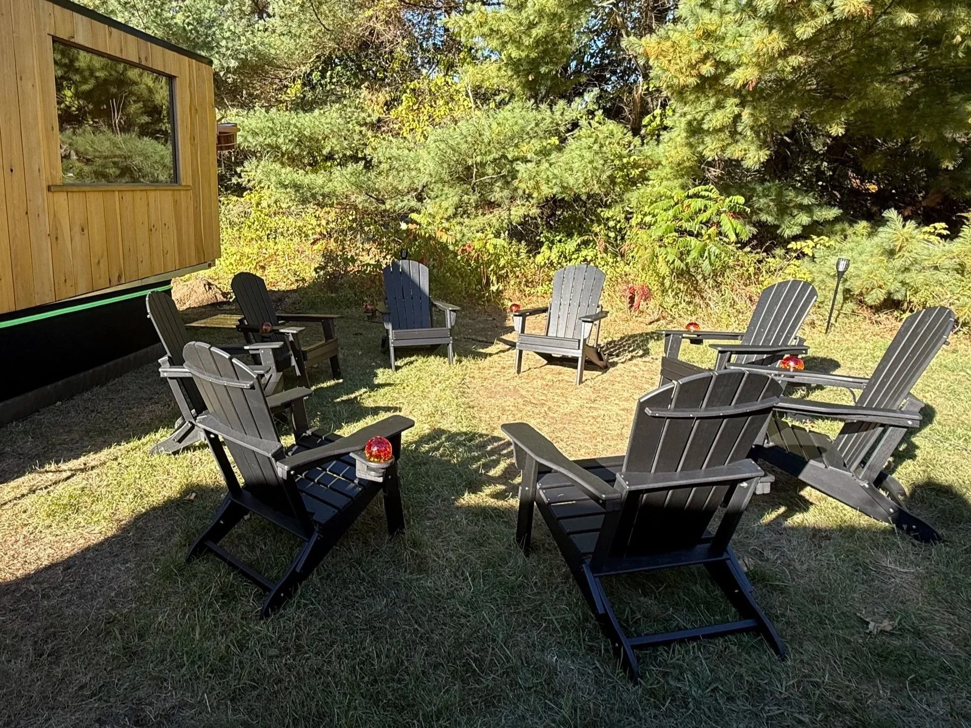 If you arrive early, please make yourself comfortable in our Adirondack chairs before your session begins. They’re also there for resting between rounds. Sometimes warmed by the sun, sometimes under the stars, the chairs offer a place to ground, socialize, or sit in quiet reflection. In the evenings, they’re softly lit by ambient solar lighting and they are always surrounded by trees. You’re very welcome to linger after your session as well, enjoying the warmth, conversation, or simply a little more time outdoors at your own pace.