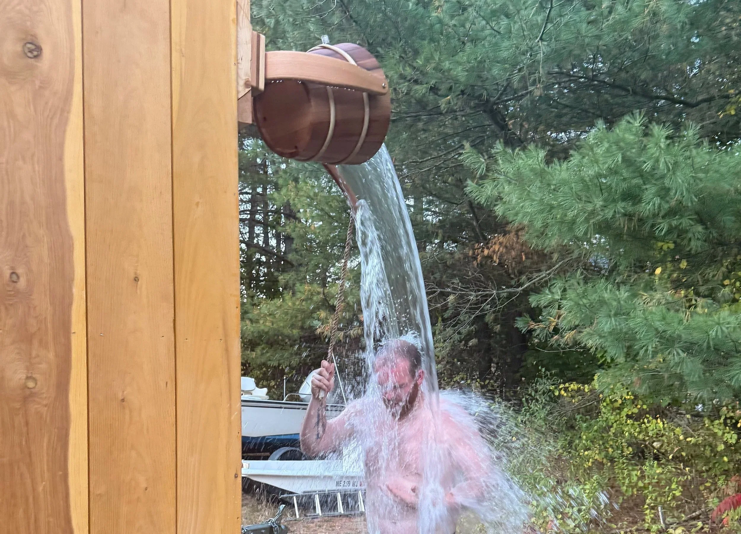 During the warmer months, we set up our much loved bucket shower. Nothing beats the invigoration of a crisp, clean cascade of water poured from above. Ours is a self-filling 5 gallons and once you get the hang of it, you might crave it as much as the heat! In the colder months when the hoses freeze, we offer smaller buckets for gently ladling water over the body between rounds. This allows for cooling as needed without the full douse. You might also try our other favorite cool-down option if the weather agrees - making a snow angel!