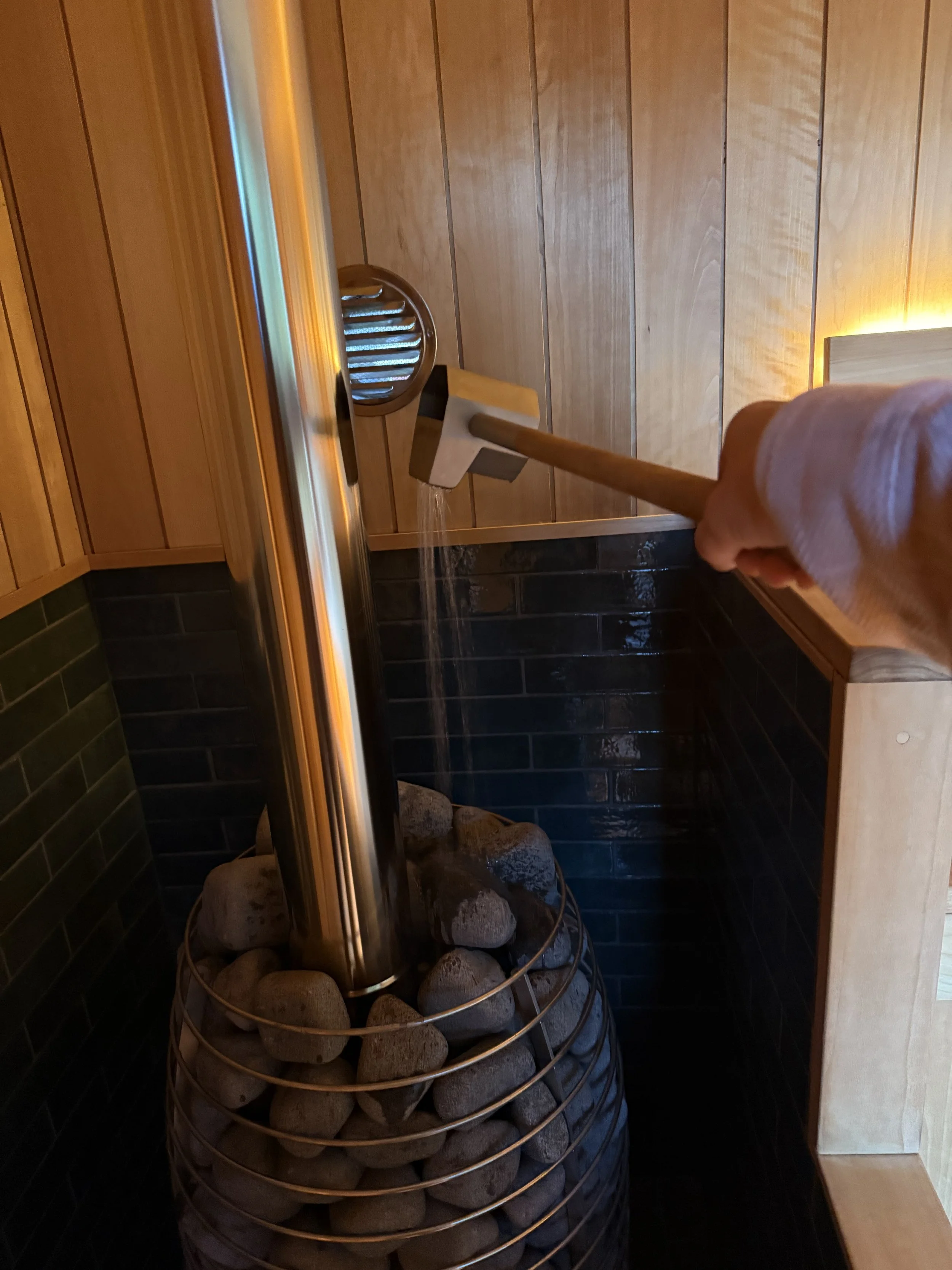 Our Regenzelle rain ladle by SAUNAGUT is a piece we fell in love with while traveling in Europe, and we knew we had to bring it home for Rove Sauna. Its large bowl and balanced walnut handle create a pour that releases steam in a smooth, even wave, making for truly wonderful löyly. Löyly is that deeply soothing, enveloping heat and steam that defines a true sauna experience. It’s one of those subtle details that makes each round feel artful and intentional.